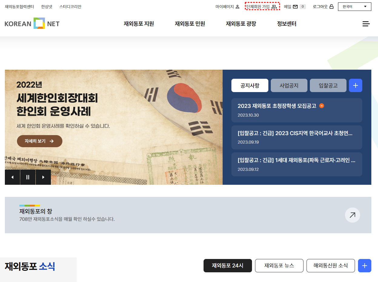 <확인사항> - 개인회원 가입여부 : 코리안넷 오른쪽 상단 로그인 클릭 → 로그인 화면 하단의 아이디 찾기 클릭 → 이름 및 이메일 입력 후 아이디 찾기를 이용하시기 바랍니다. - 아이디 확인 시 : 개인아이디로 로그인 후 오른쪽 상단 개인회원 이름 클릭 → 단체회원가입 클릭 → 서비스 약관 및 개인정보수집동의, 단체정보공개동의 체크 후 하단 동의함 클릭 → 단체정보 입력 후 하단 승인요청 클릭하시기 바랍니다. ※ 단체회원 가입 승인요청 기간 1일~3일 소요